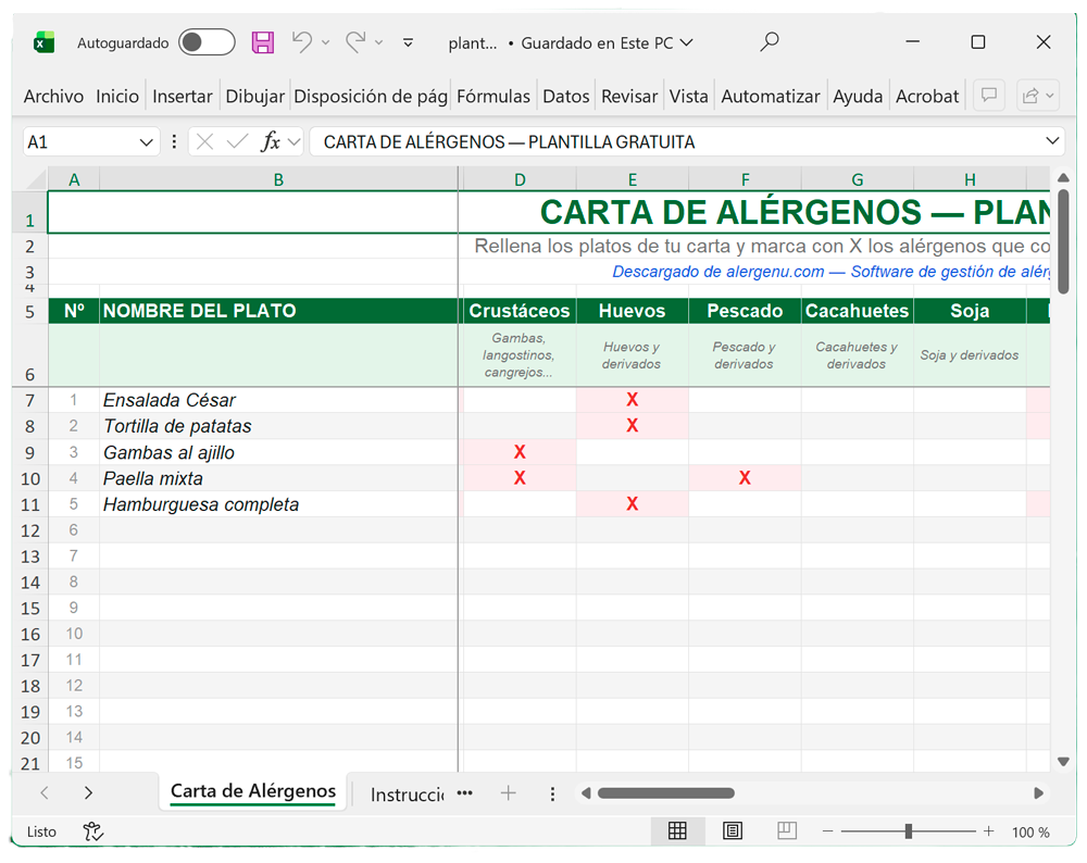 Nuestra plantilla de alérgenos Excel gratis ya incluye los 14 iconos oficiales y las columnas preparadas para que solo tengas que marcar con una X.